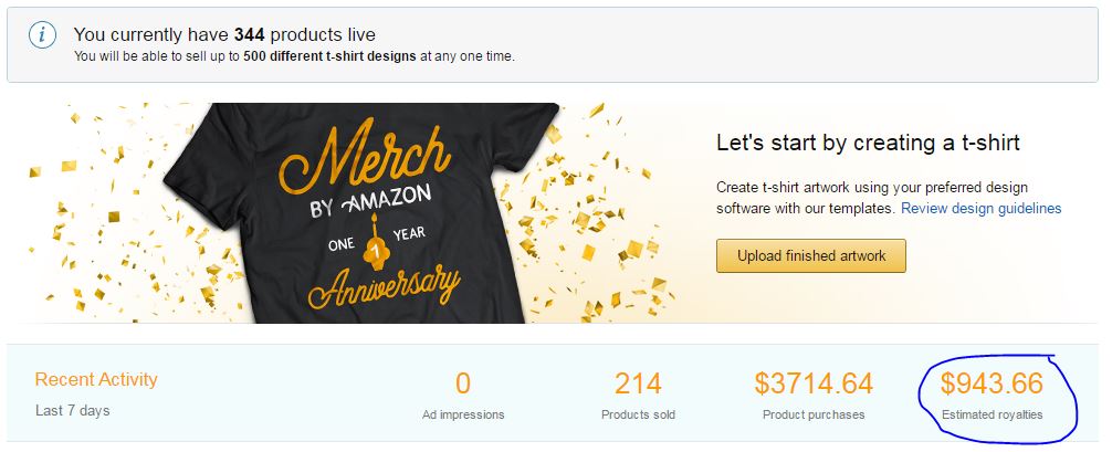 De tijdelijk gestaakte print-on-demand service Merch by Amazon houdt in dat elke geregistreerde gebruiker designs kan uploaden die vervolgens op de marktplaats van Amazon worden gezet. Oorspronkeijk ging het alleen om designs voor T-shirts, maar al snel volgden onder meer hoodies, longsleeve shirts en sweat shirts. Ontwerpers van motieven ontvangen voor elke bestelling, afhankelijk van de verkoopprijs, gemiddeld 25% van de omzet en betalen geen kosten. Amazon regelt zelf dat het geüploade design via een grafische partner wordt geprint, de promotie en verkoop, de opslag en de verzending naar de klant: eigenlijk dus alles. Als grafisch ontwerper kun je aan één design meerdere keren geld verdienen. Dat kan behoorlijk oplopen, zoals uit het volgende plaatje blijkt. Een maandinkomen van 4.000 dollar is zeker geen uitzondering.